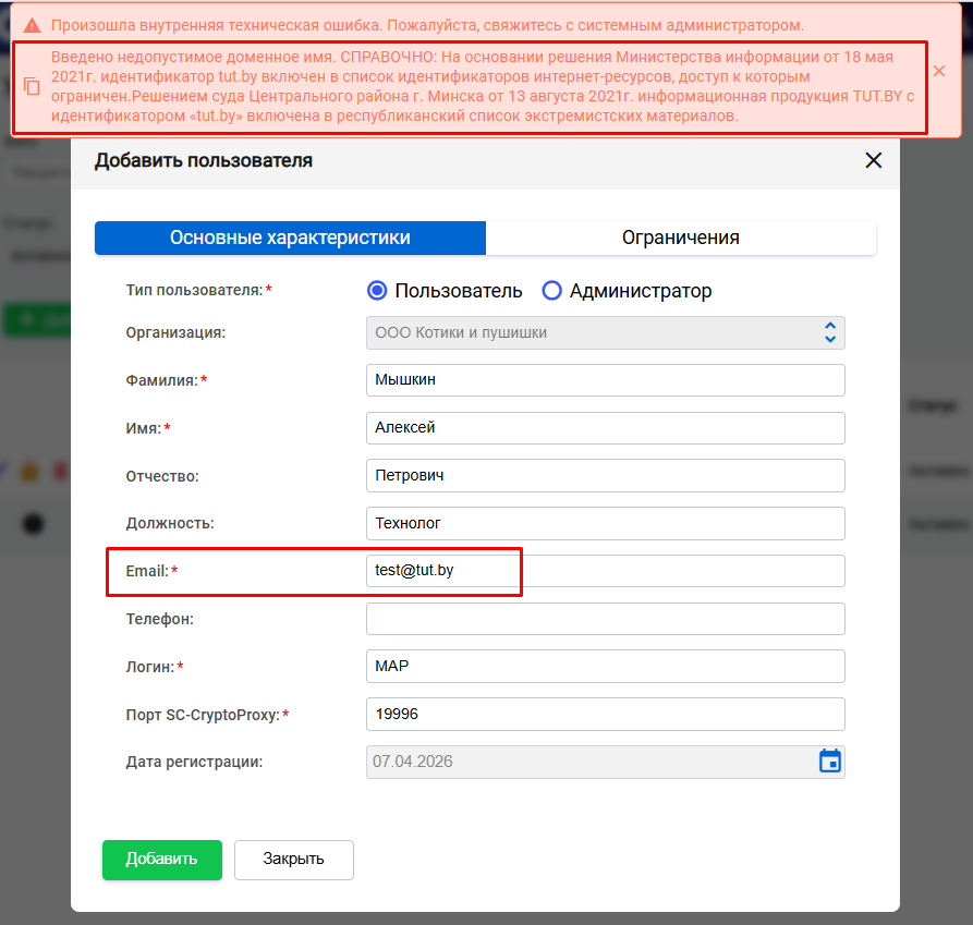 4. Ограничение использования email, связанных с идентификатором «tut.by», при регистрации пользователей и компаний.