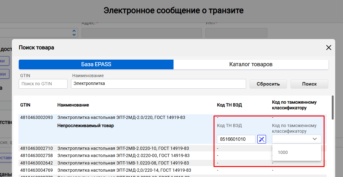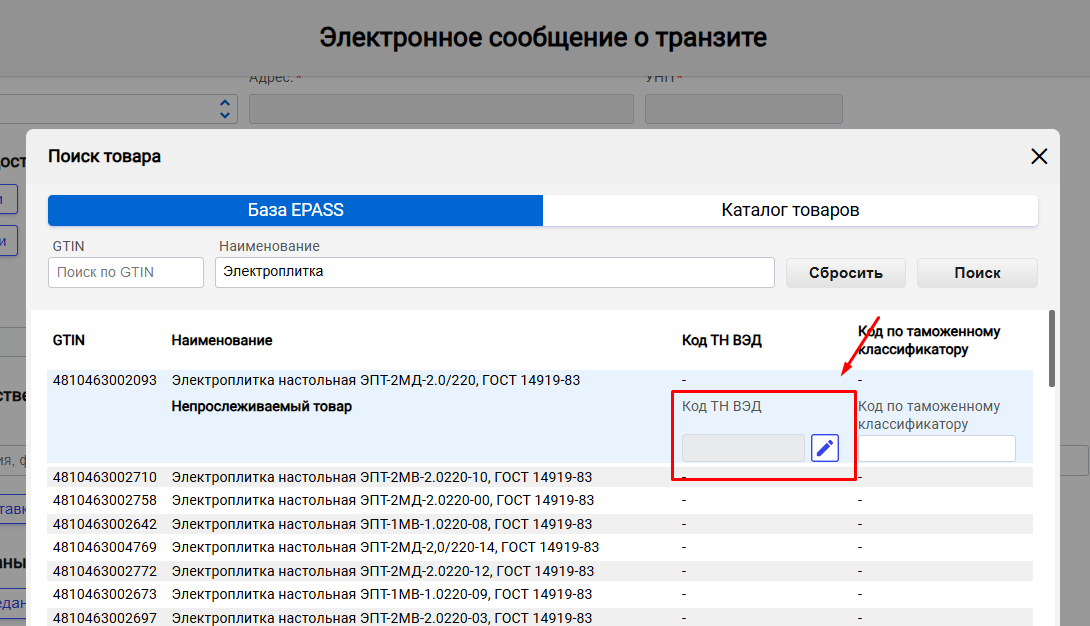 3. Редактирование кодов ТН ВЭД при поиске товаров в эНакладных и Сообщениях о транзите;