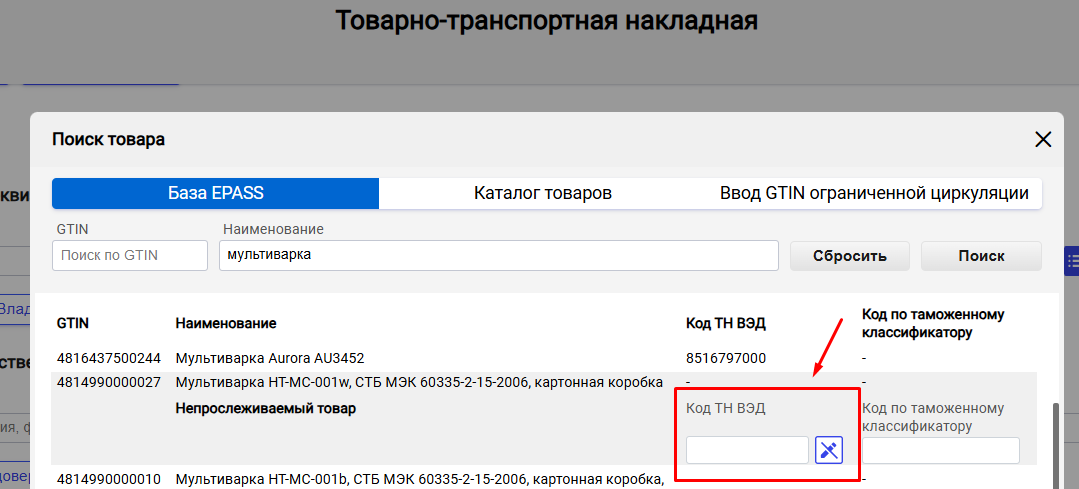 Для типов документы «Накладные» и «Сообщения о транзите» реализована возможность редактирования кодов ТН ВЭД при поиске товаров.