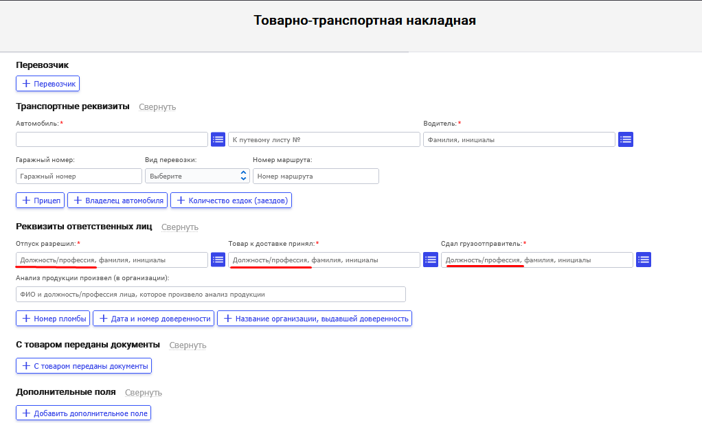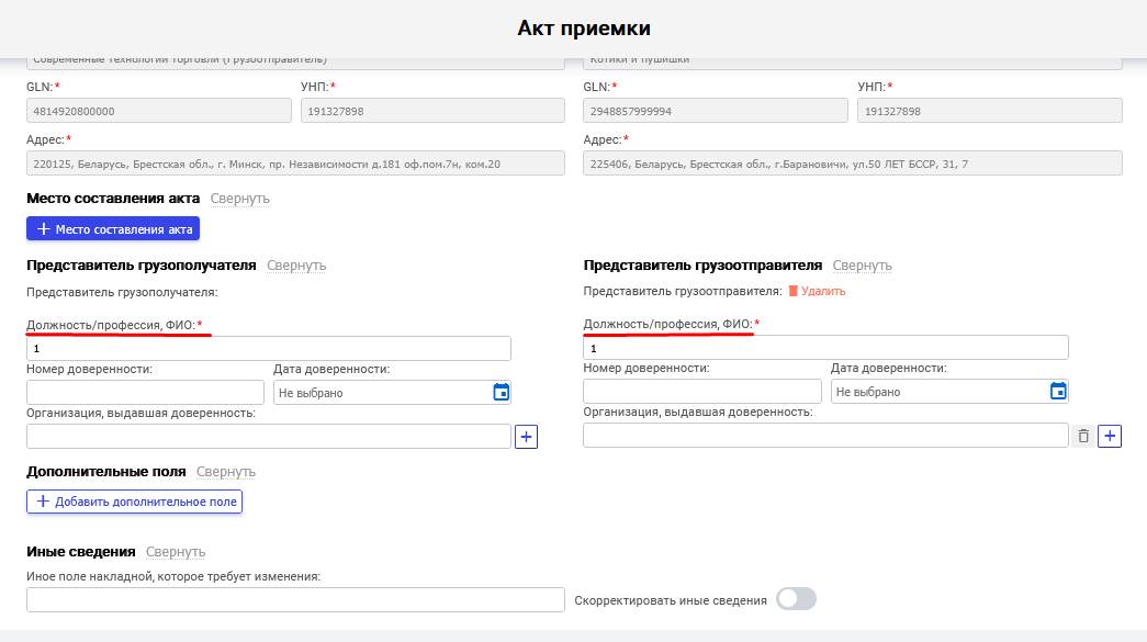 • Электронный акт приемки (BLRADF): поле «Должность, ФИО» (для блоков Представитель грузополучателя и Представитель грузоотправителя) — на «Должность/профессия, ФИО».