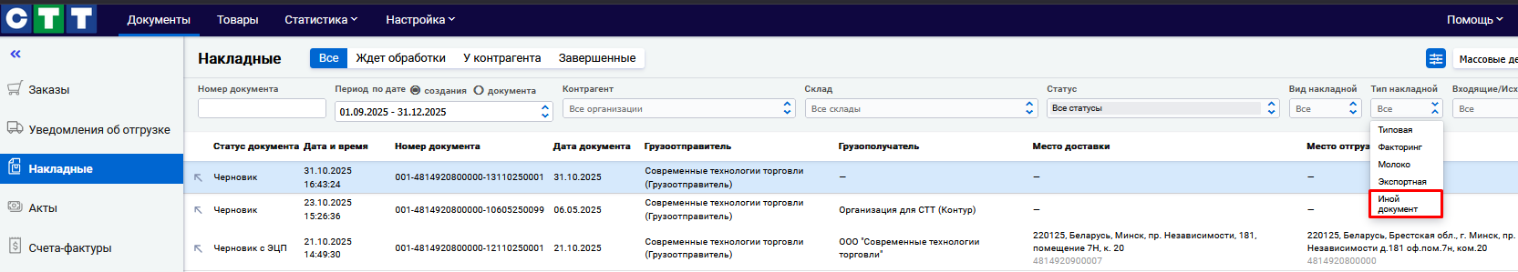 В списке эНакладных (Раздел «Накладные») доработан поиск иных документов при использовании фильтра  «Тип накладной».
